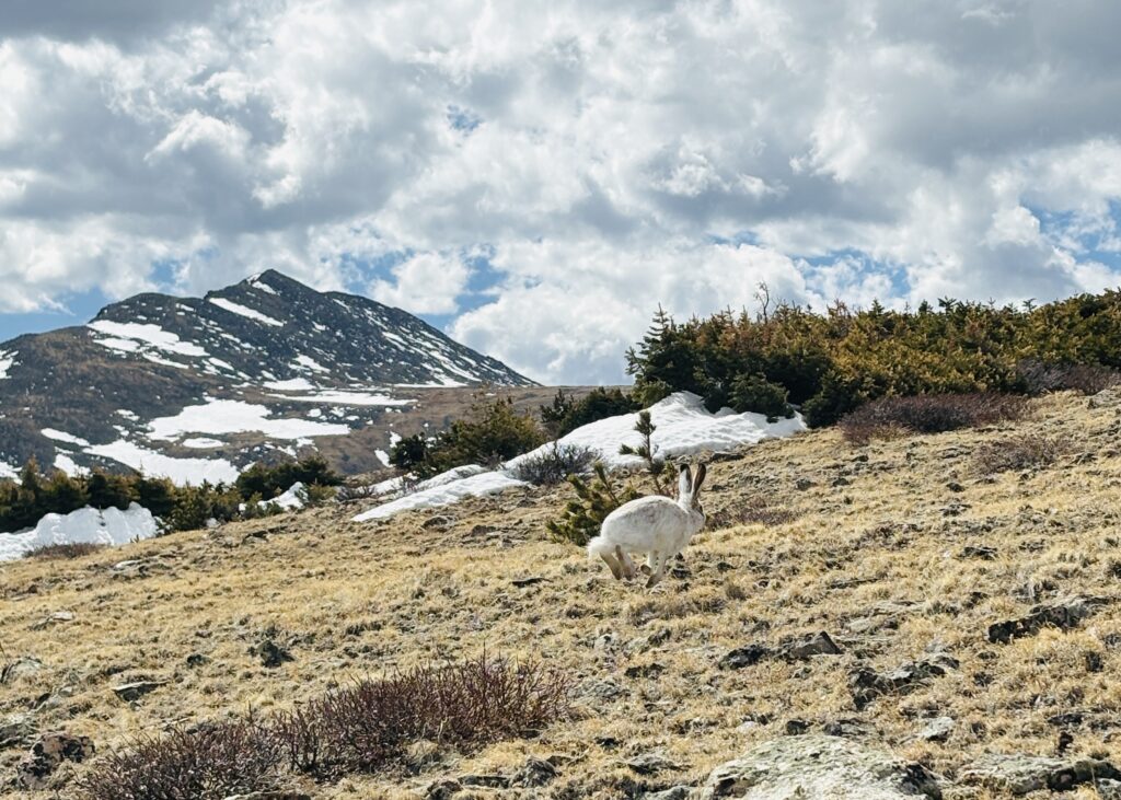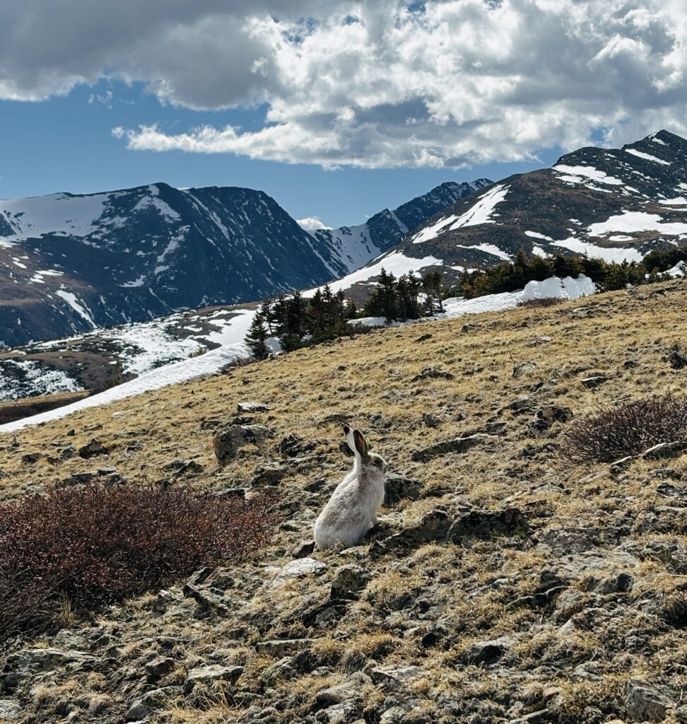 On the Niwot Ridge Biosphere Reserve – Snowshoe hare with Boulder watershed in the background